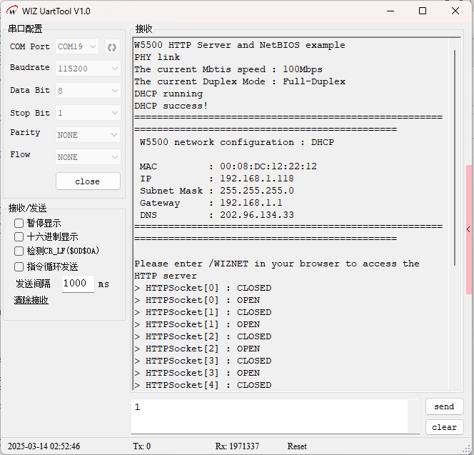 httpServer_init(http_tx_ethernet_buf, http_rx_ethernet_buf, _WIZCHIP_SOCK_NUM_ - 1, socknumlist); // Initializing the HTTP server步骤2:在主循环中执行HTTP服务器和NetBIOS解析