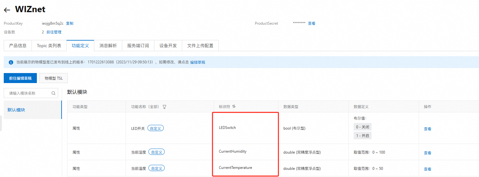 创建产品和添加物模型:登录阿里云物联网平台,创建产品并在产品下添加以下物模型功能。