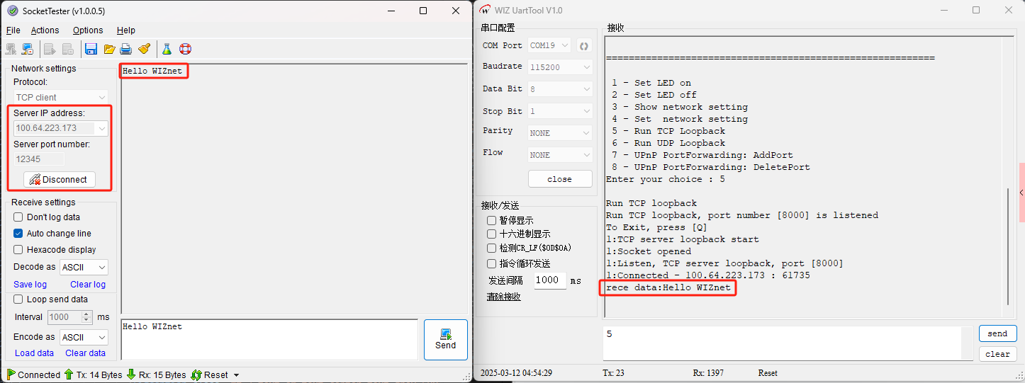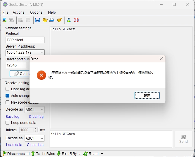 随后,我们打开一个网络调试助手,例如SocketTester,选择为TCP Client模式,服务器地址为外部IP地址也就是100.64.223.173,端口号为外部端口号12345, 点击”Connect”连接后,可以看到成功连接到内部的W5500上了。UDP也是同样进行操作,这里不再演示。