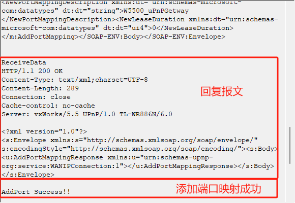 }最后则是发送请求,然后通过parseAddPort()函数解析响应内容判断是否添加端口映射成功。
