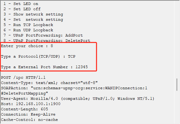 接着我们输入Q退出回环测试程序,然后输入8,将之前添加的TCP协议的12345外部端口删除。 在UPnP Wizard上点击刷新,可以看到已经成功删除,再次执行回环测试程序,已经无法连接上内部的W5500上。