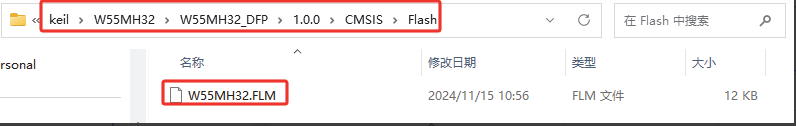 其中,W55MH32.FLM文件在keil安装目录下的W55MH32\W55MH32_DFP\1.0.0\CMSIS\Flash路径中,如下图所示。