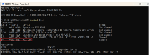 注意: 将 4-4 替换为 usbipd list 命令显示的实际总线ID。有关usbipd的详细文档,请参考此链接