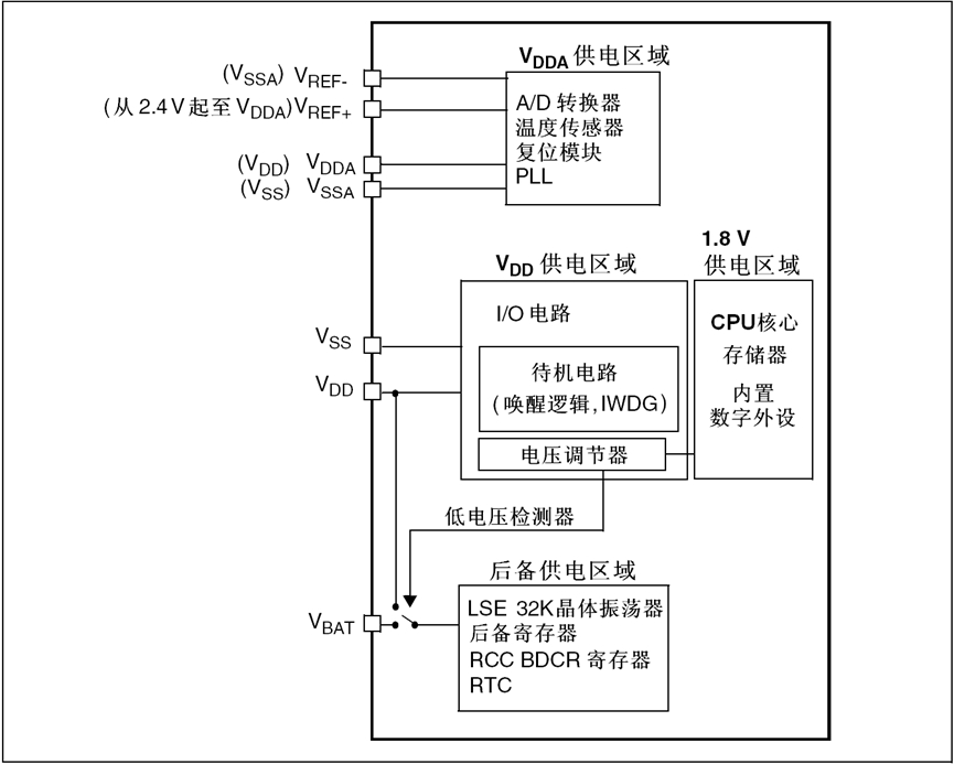 调压器可以运行在“运行模式”、“停止模式”以及“待机模式”。在运行模式下,1.8V域全功率运行;在停止模式下1.8V域运行在低功耗状态, 1.8V区域的所有时钟都被关闭,相应的外设都停止了工作,但它会保留内核寄存器以及SRAM的内容;在待机模式下,整个1.8V域都断电, 该区域的内核寄存器及SRAM内容都会丢失(备份区域的寄存器不受影响)。