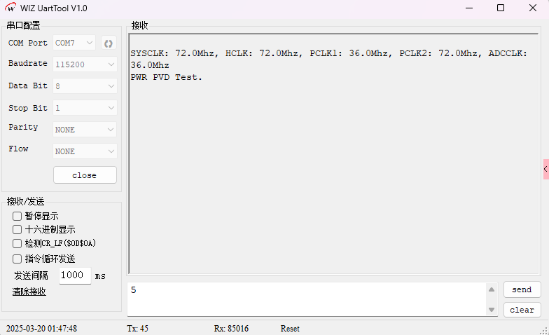这段代码通过配置 PVD 功能,实时监测电源电压,并在电压高于或低于设定阈值时触发中断,通过串口输出相应的提示信息。同时,还配置了串口通信功能,用于输出系统时钟频率信息和 PVD 监测结果。