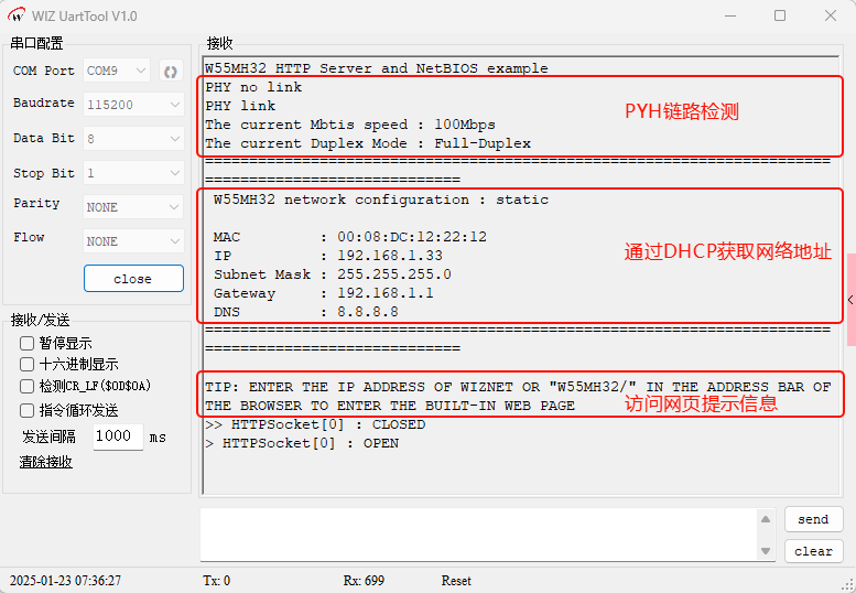 烧录例程运行后,首先进行了PHY链路检测,然后是通过DHCP获取网络地址并打印网络地址信息, 通过NetBIOS名称解析打印提示解析名称,接着我们打开浏览器,输入W55MH32/进行即可访问网页信息: