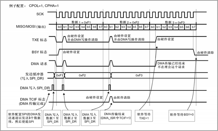 - 发送过程:TXE标志置1时触发DMA请求,DMA控制器将数据从内存搬运至SPI_DR寄存器。