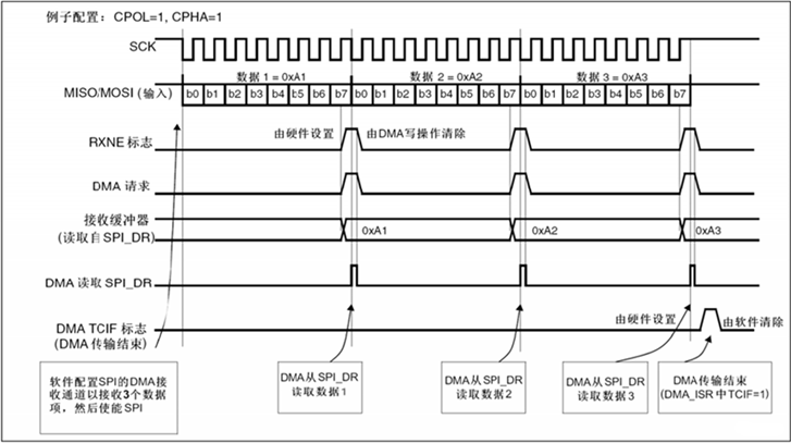 - 接收过程RXNE标志置1时触发DMA请求,DMA控制器将数据从SPI_DR寄存器搬运至内。