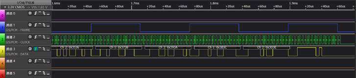 同样的,首帧和尾帧的数据实际也已经可以看到有数据脉冲信号,未解析属于硬件初始化特性(FIFO填充)或解析器同步延迟原因,不影响实际音频功能。