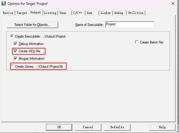 在MDK中,针对armar和fromelf工具的选项几乎没有,仅集成了生成HEX或Lib的选项, 见下图,控制fromelf生成hex及控制armar生成lib的配置: