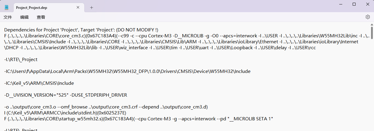 *.dep和*.d文件(Dependency file)记录的是工程或其它文件的依赖,主要记录了引用的头文件路径,其中*.dep是整个工程的依赖, 它以工程名命名,而*.d是单个源文件的依赖,它们以对应的源文件名命名。这些记录使用文本格式存储,我们可直接使用记事本打开, 见下两图,工程的dep文件内容和bsp文件的内容:
