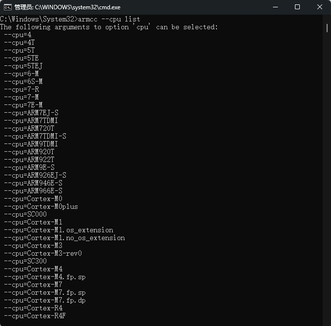 例如根据它的帮助说明,“–cpu list”可列出编译器支持的所有cpu,我们在命令行中输入“armcc –cpu list”, 可查看图中的cpu列表: