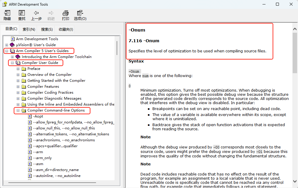 了解这些,我们就可以查询具体的MDK编译选项的具体信息了,如c/c++选项中的“Optimization:Leve 1(-O1)”是什么功能呢? 首先可了解到它是“-O”命令,命令后还带个数字,查看MDK的帮助手册,在armcc编译器说明章节, 可详细了解,如下图,编译器选项说明: