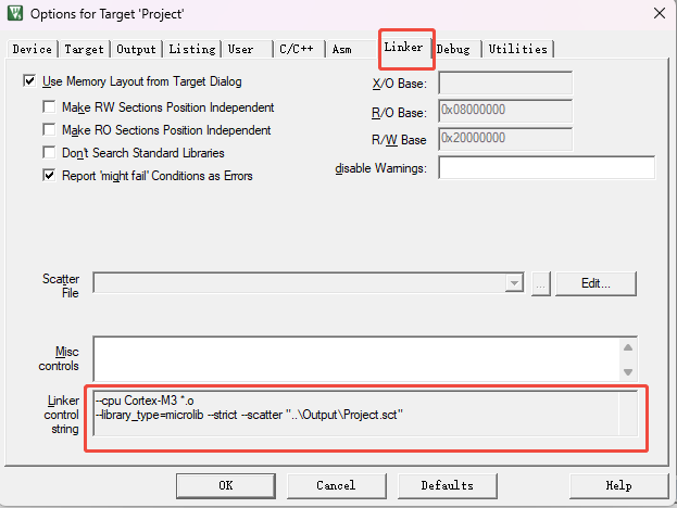 链接器默认是根据芯片类型的存储器分布来生成程序的,该存储器分布被记录在工程里的sct后缀的文件中,有特殊需要的话可自行编辑该文件, 改变链接器的链接方式,具体后面我们会详细讲解。