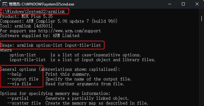 帮助提示中分三部分,第一部分是armcc版本信息,第二部分是命令的用法,第三部分是主要命令选项。