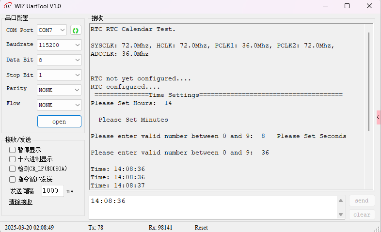 }该函数用于调整 RTC 计数器的值,调用Time_Regulate()函数获取用户设置的时间,并将其设置到 RTC 计数器中。