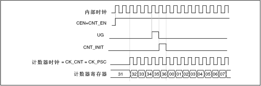 下图显示控制电路和向上计数器在一般模式下,不带预分频器时的操作。