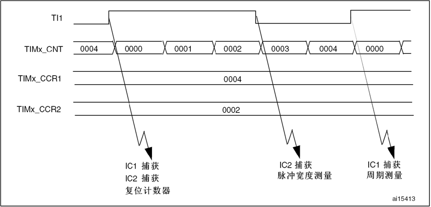 例如,你需要测量输入到 TI1 上的 PWM 信号的长度(TIMx_CCR1 寄存器)和占空比(TIMx_CCR2 寄存器),具体步骤如下(取决于 CK_INT 的频率和预分频器的值):