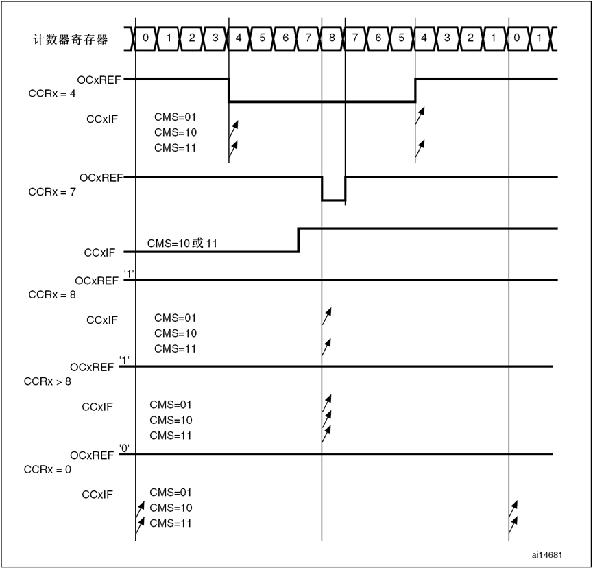 TIMx_CR1 寄存器的 CMS=01,在中央对齐模式 1 下,当计数器向下计数时设置比较标志。