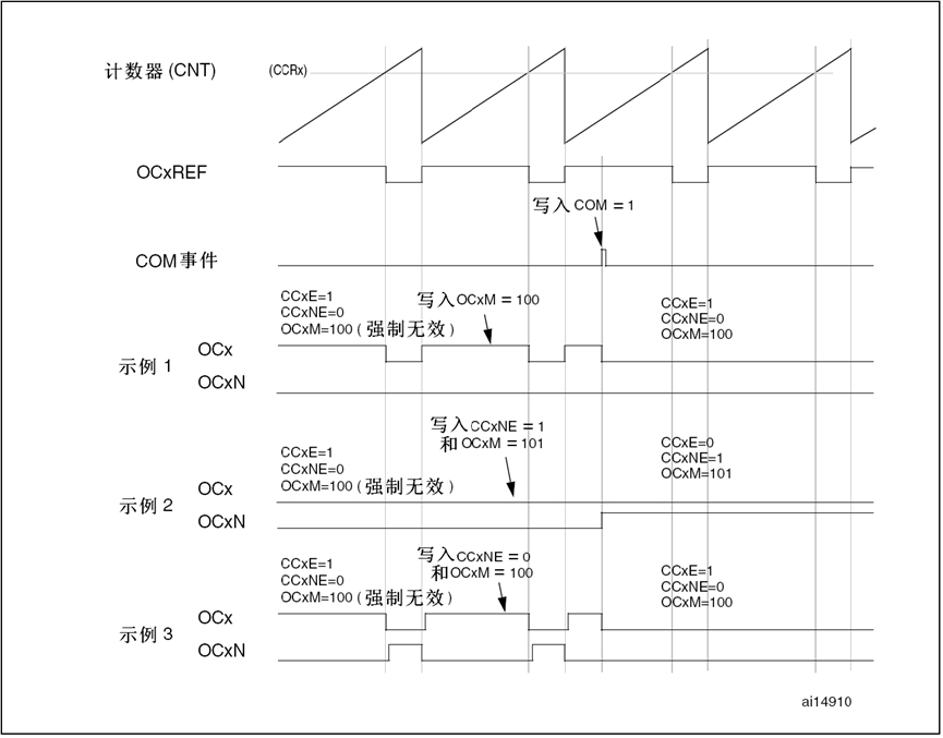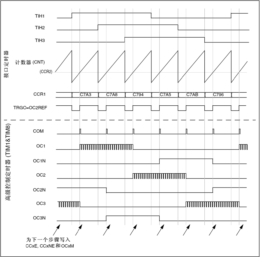 选择 OC2REF 作为 TRGO 上的触发输出:置 TIMx_CR2 寄存器中的 MMS=101。在高级控制寄存器TIM1中,正确的ITR输入必须是触发器输入,定时器被编程为产生PWM信号,捕获/比较控制信号为预装载的(TIMx_CR2 寄存器中 CCPC=1),同时触发输入控制 COM 事件(TIMx_CR2 寄存器中 CCUS=1)。在一次 COM 事件后,写入下一步的 PWM 控制位(CCxE、OCxM),这可以在处理 OC2REF 上升沿的中断子程序里实现。下图显示了这个实例: