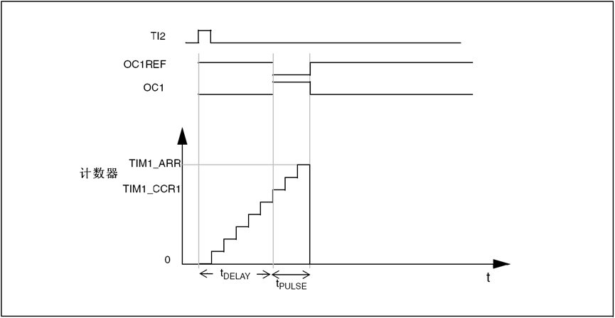 同步的精度可以达到计数器的一个计数周期。输出比较模式(在单脉冲模式下)也能用来输出一个单脉冲。