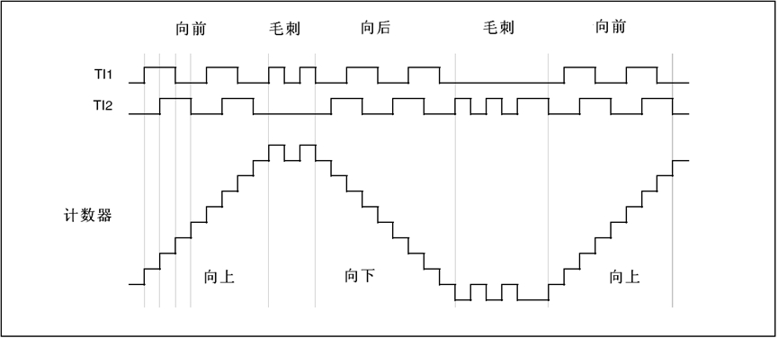 当上升沿出现在 TI2,计数器计数一次,且 TIF 标志被设置。在 TI2 的上升沿和计数器实际时钟之间的延时,取决于在 TI2 输入端的重新同步电路。