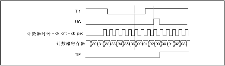 下图显示当自动重装载寄存器 TIMx_ARR=0x36 时的动作。在 TI1 上升沿和计数器的实际复位之间的延时取决于 TI1 输入端的重同步电路: