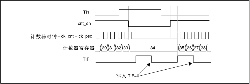 只要 TI1 为低,计数器开始依据内部时钟计数,一旦 TI1 变高则停止计数。当计数器开始或停止时都设置 TIMx_SR 中的 TIF 标置。TI1 上升沿和计数器实际停止之间的延时取决于 TI1 输入端的重同步电路: