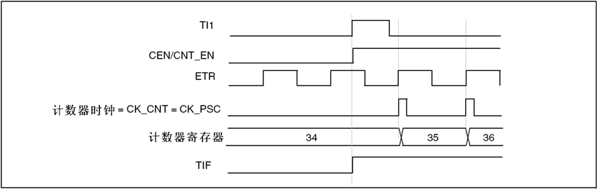 在下面的例子中,一旦在 TI1 上出现一个上升沿,计数器即在 ETR 的每一个上升沿向上计数一次: