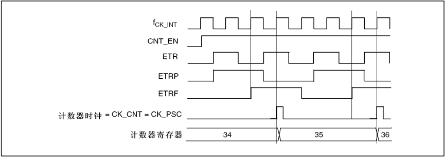 - ETP=0:检测 ETR 的上升沿,置 ECE=1 使能外部时钟模式 2。