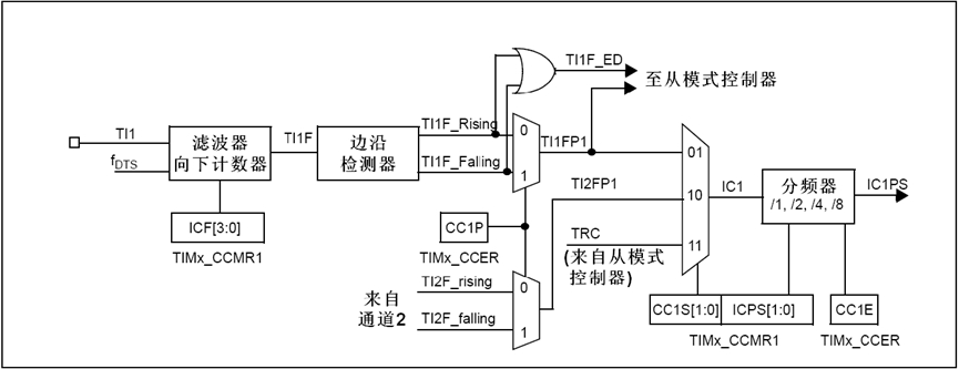 设置通道 1 为捕获模式(选中 TRC):置 TIMx_CCMR1 寄存器中 CC1S=01,如果需要,还可以设置数字滤波器。