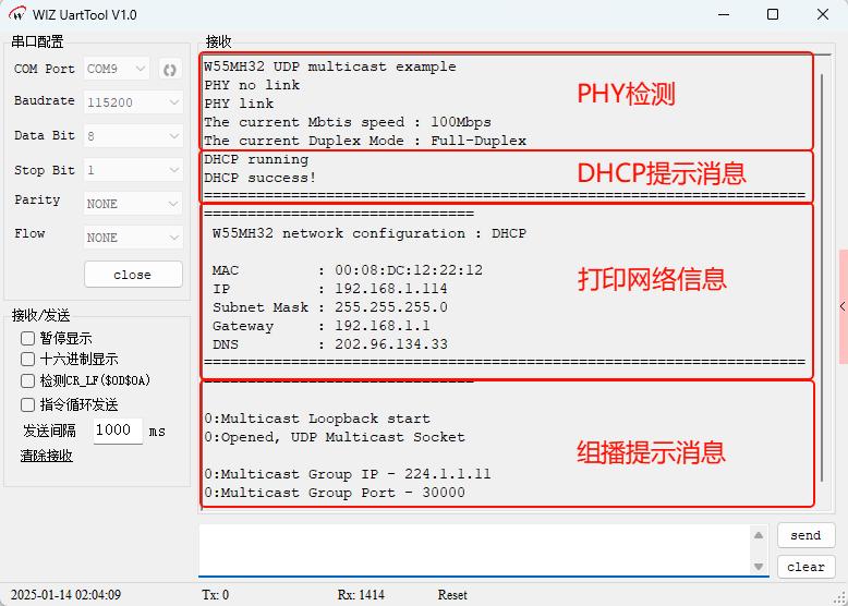 烧录例程运行后,首先进行了PHY链路检测,然后是DHCP获取网络地址结果,最后是进行UDP组播回环测试,如下图所示: