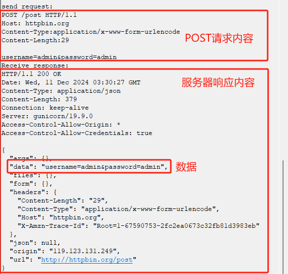 我们向httpbin.org发送请求后,它会把我们请求时提交的参数体现在响应内容中。