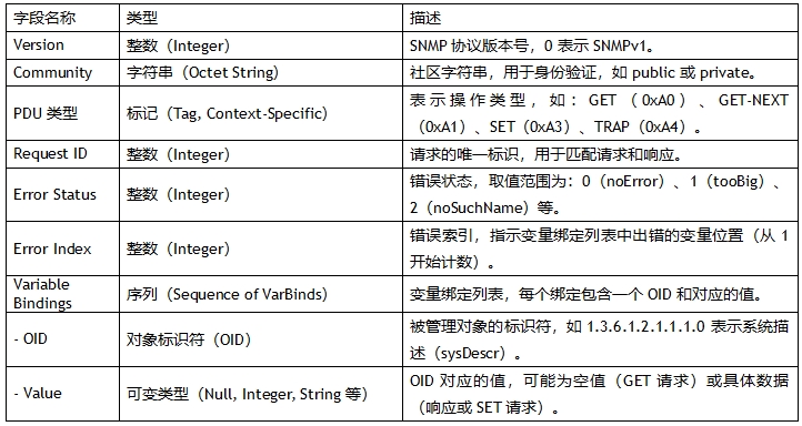 SNMP 报文基于ASN.1(Abstract Syntax Notation One)编码规则,通常使用BER(Basic Encoding Rules)进行传输。以下是SNMP报文的基本格式和关键字段,本例程中使用的是SNMPv1版本,以下对SNMPv1进行讲解, 而对于其他版本的报文格式,由于篇幅有限,这里将不再进行讲解,感兴趣的朋友可自行查阅资料进行学习。