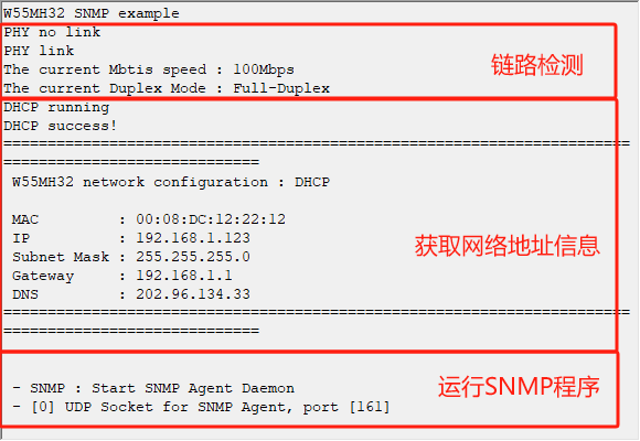 烧录例程运行后,首先可以看到打印了PHY链路检测和DHCP获取网络信息,然后是运行SNMP程序: