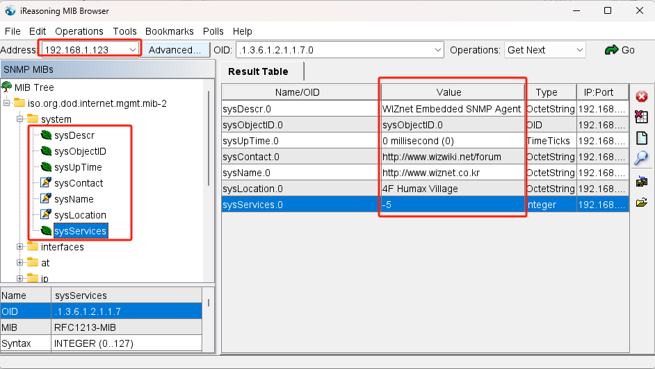 打开MIB Borwser,输入W55MH32的地址,然后依次点击system分支下的各个节点,获取到的结果与代码定义相同: