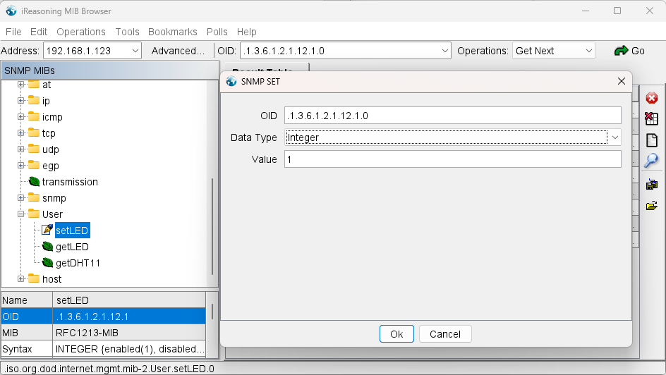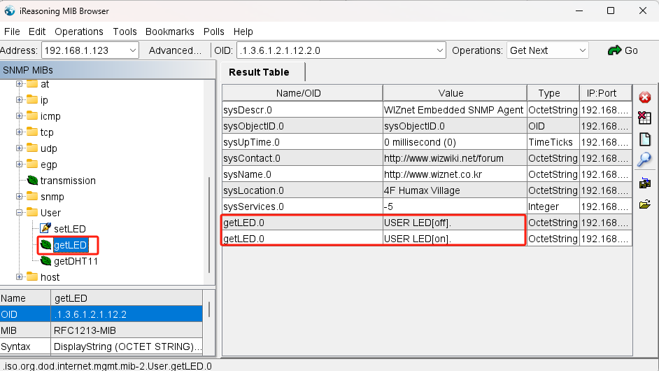 MIB Browser向W55MH32发送LED设置报文:
