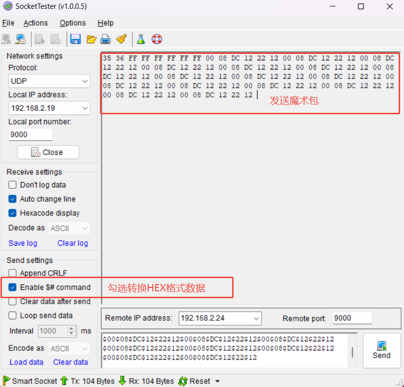 烧录例程运行后,首先进行了PHY链路检测,然后通过DHCP设置网络信息,通过网络调试助手发送魔术包实现远程唤醒。使用sockettest网络助手发送hex格式数据 需要勾选Enable $# command选项在每个数据前面加上$符号,注意不能有空格,空格会被转换为0X20。