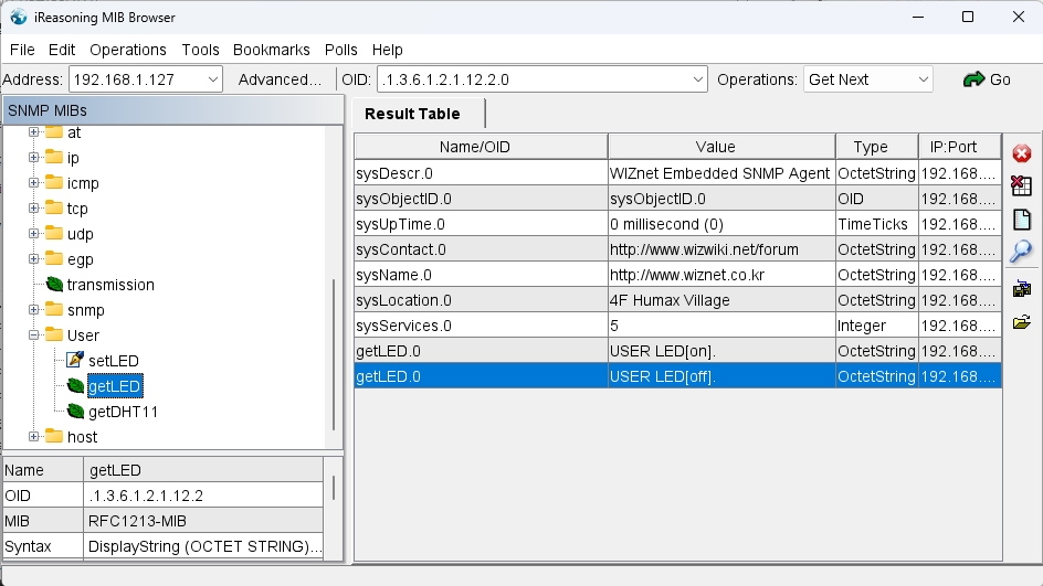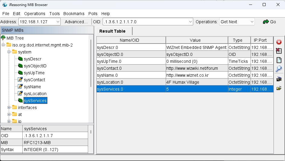 打开MIB Borwser,输入W5500的地址,然后依次点击system分支下的各个节点,获取到的结果与代码定义相同: