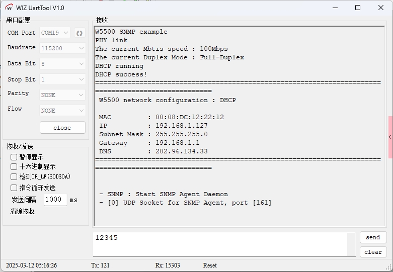 烧录例程运行后,首先可以看到打印了PHY链路检测和DHCP获取网络信息,然后是运行SNMP程序: