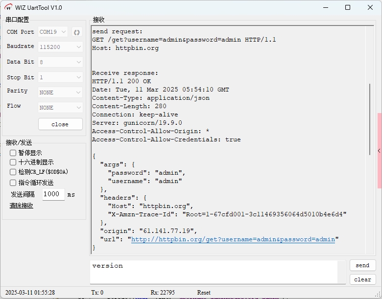 接着我们发送了一次GET请求报文,然后HTTP服务器返回了响应报文。 请求和响应原文都通过串口打印出来,如下图所示: