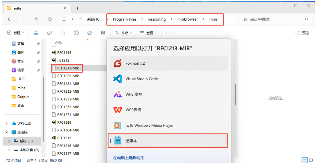 打开安装目录下 mibs 文件夹,找到 RFC1213-MIB 文件,右键使用记事本打开,上方路径栏可以寻找路径。