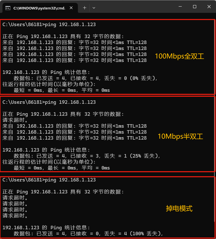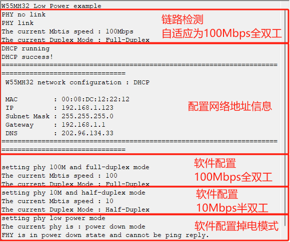 烧录例程运行后,首先可以看到进行了PHY链路检测,然后打印了设置的网络地址信息, 依次设置PHY为100Mbps全双工模式,然后设置PHY为10Mbps半双工模式,最后设置为PHY为掉电模式,打印信息如下图所示: