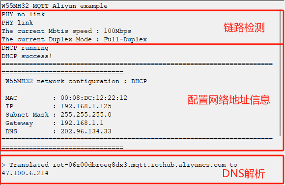 烧录例程运行后,首先进行了PHY链路检测,然后通过DHCP打印设置网络信息,最后连接MQTT服务器进行回环测试,如下图所示: