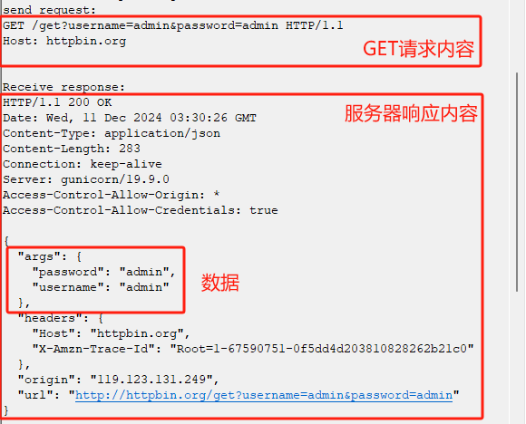 我们向httpbin.org发送请求后,它会把我们请求时提交的参数体现在响应内容中。