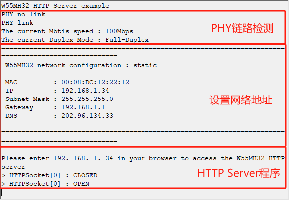 该例程用到的其他网络协议,例如DHCP, 请参考相关章节。有关 W55MH32 的初始化过程,请参考Network install,这里将不再赘述。