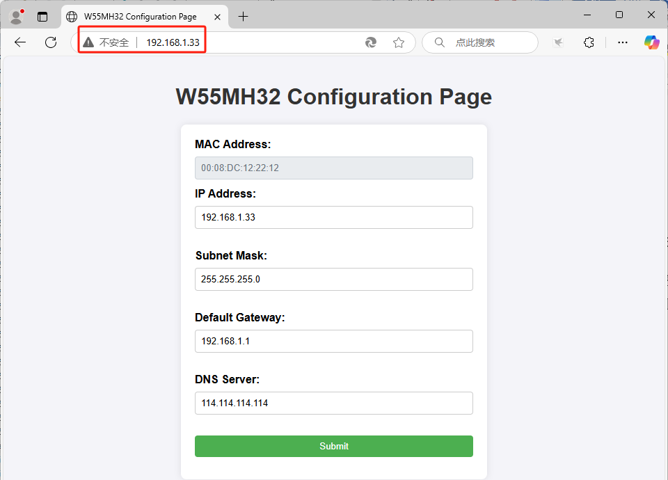 然后我们将IP地址改为192.168.1.33,DNS服务器地址改为114.114.114.114,并点击Submit按钮。 等待W55MH32重启后,浏览器会自动跳转至新地址。