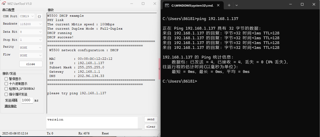烧录例程运行后,首先打印了PHY链路检测的结果以及DHCP日志信息, 然后打印了网络地址信息,这里可以看到配置方式为DHCP,IP地址为192.168.1.137,最后是PING提示消息。 接着在PC端打开CMD,PING W5500的IP地址,可以正常PING通。