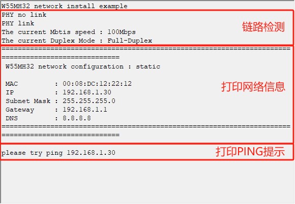 烧录例程运行后,首先可以看到进行了PHY链路检测,然后打印了设置的网络地址信息以及PING提示信息。