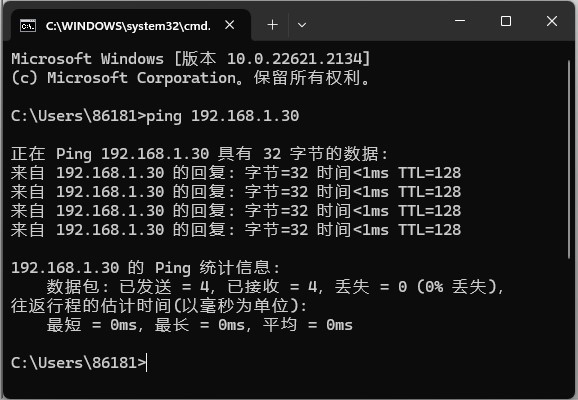 使用PC端PING W5500的IP地址(192.168.1.30),可以PING通。